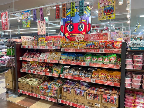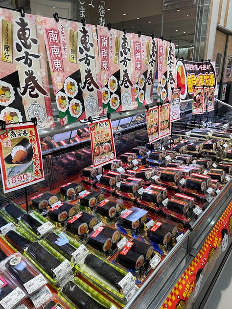 At the end of January, walking into a Japanese supermarket reveals a world overflowing with extraordinary colors. Replacing the quiet lingering of the New Year, the shelves are filled with angry red and blue masks, alongside unnaturally bright yellow permed wigs. Beside them, wooden measuring cups known as 升 (Masu) — square measuring boxes are piled high with roasted soybeans, and in the seafood section, vibrant signs promote pre-orders for lavish sushi rolls called 恵方巻き (Ehō-maki) — lucky direction rolls.