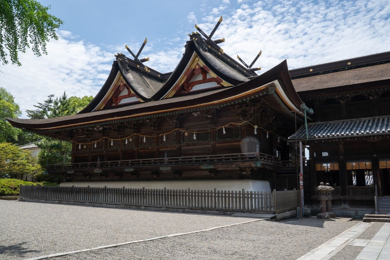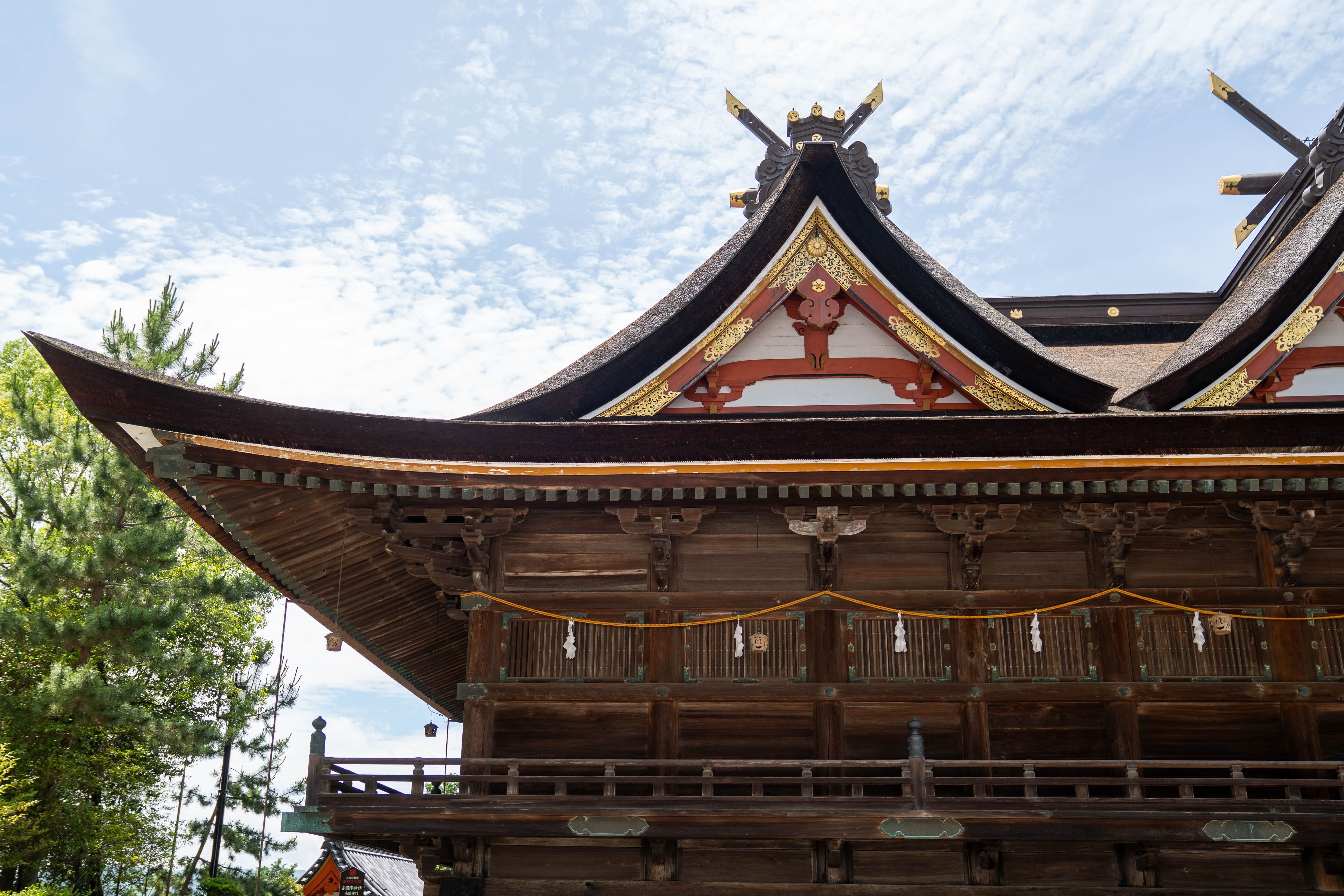 The main hall and worship hall of Kibitsu Shrine are designated National Treasures. They are built in a unique architectural style called “Kibitsu-zukuri,” which features a rare hi-yoku irimoya-zukuri structure with two gabled roofs extending front and back.