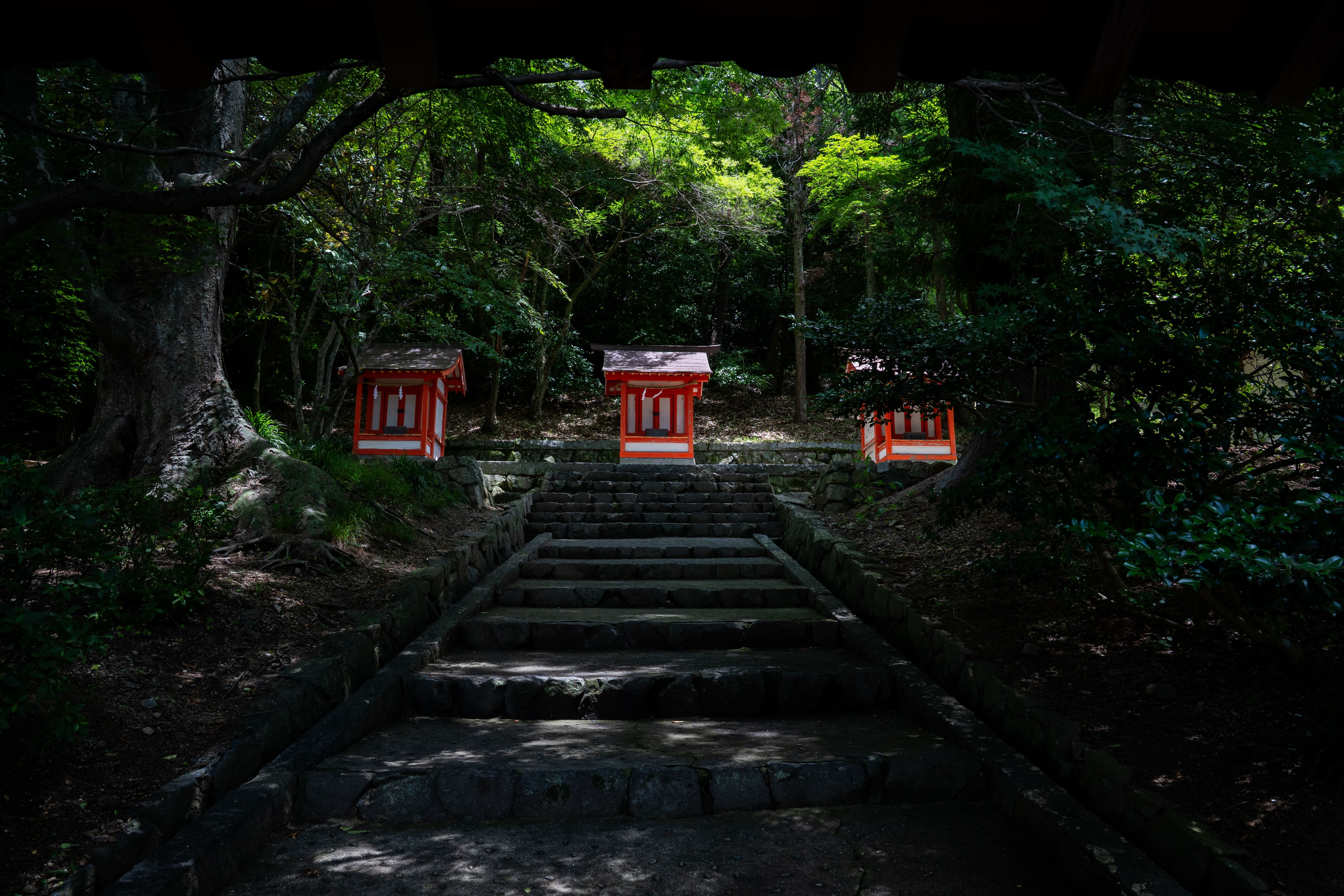 The stone steps leading to Iwayama Shrine are especially beautiful in early summer, when hydrangeas bloom in vibrant colors, adding brightness to the calm shrine grounds.