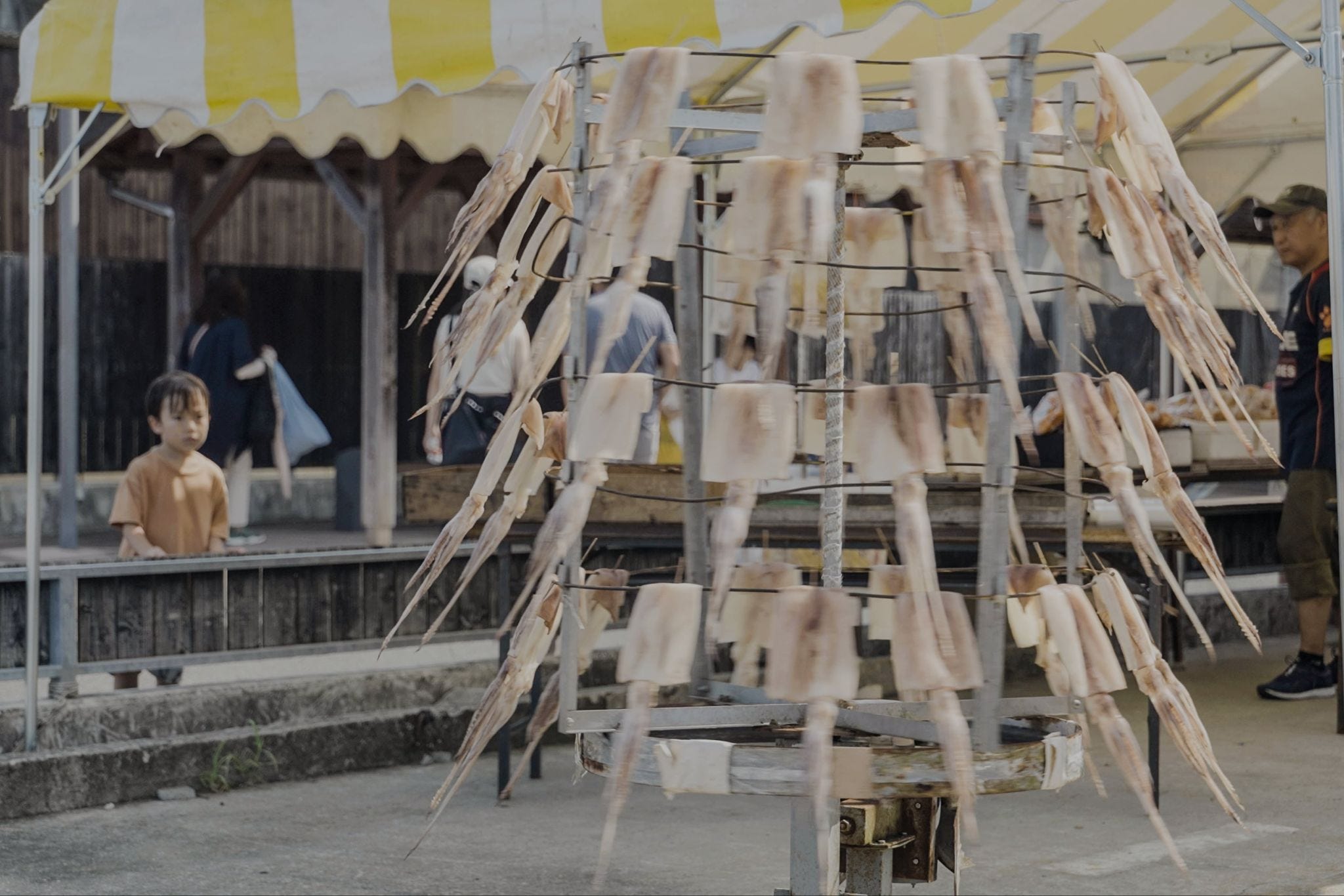 Upon arriving at the small seaside town, the first thing we saw were rows of squid spinning slowly as they dried in the sun.