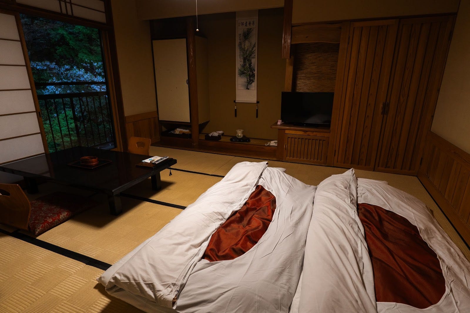 In traditional Japanese inns, it is common to sleep on futons laid directly on tatami mats — flooring made from woven rush grass, known for its gentle scent and soft texture. After warming oneself in the bath, guests rest on the futon in a serene room, allowing both body and mind to unwind.