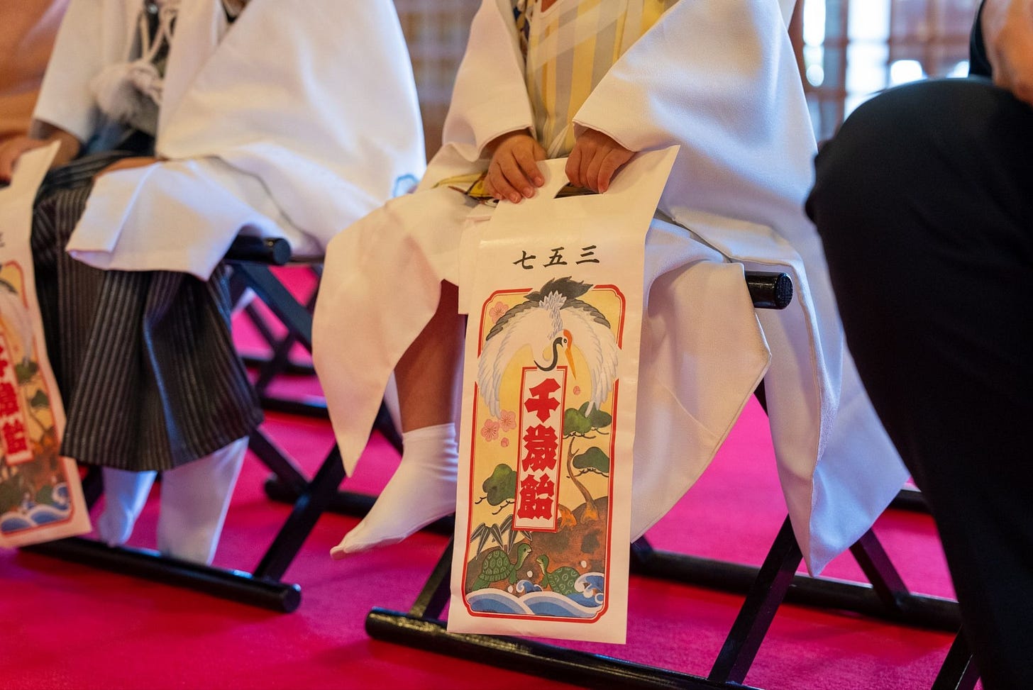 At three, children wear a sleeveless kimono called hifu, without an obi; at seven, they wear a full kimono with an obi, just like adults.