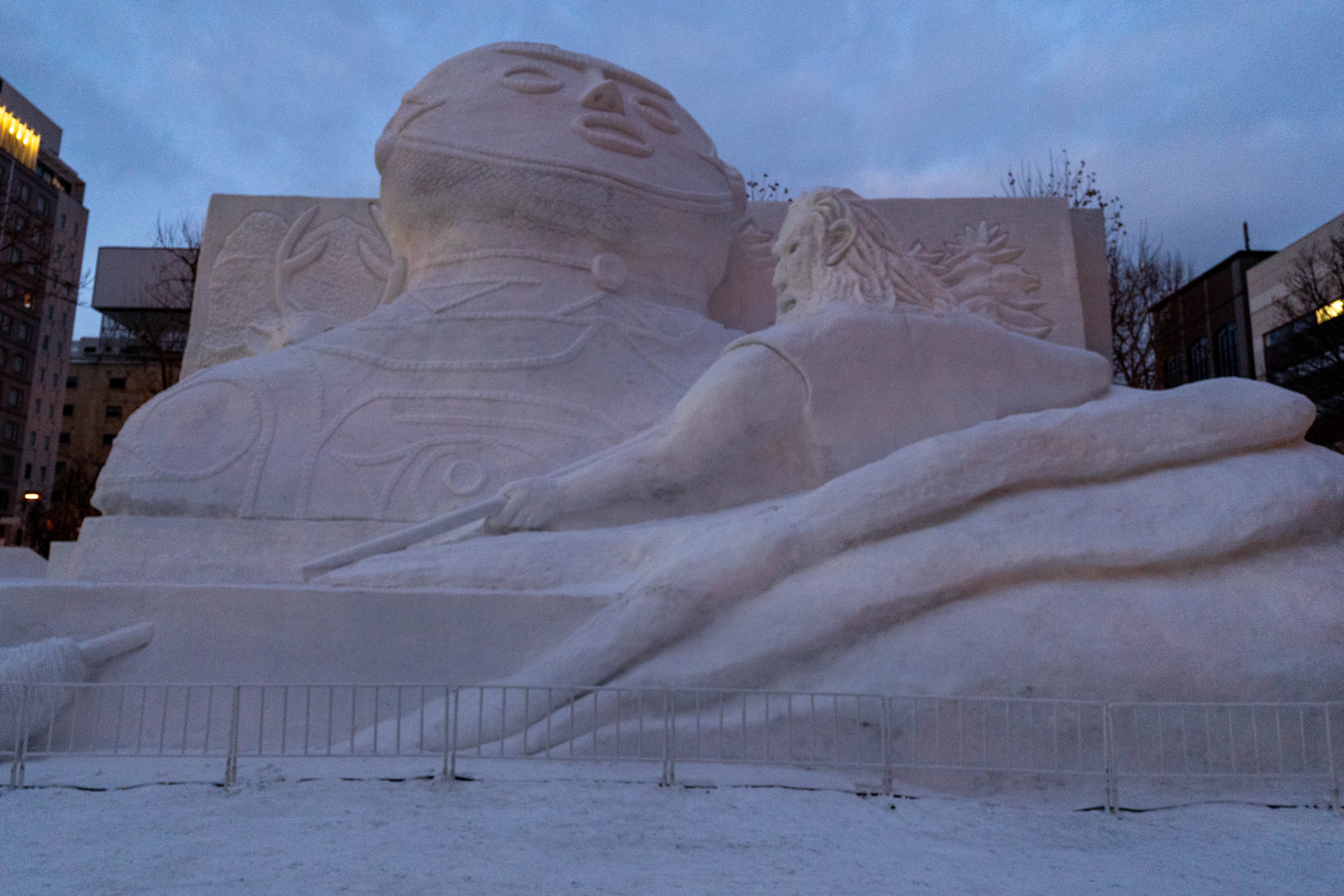 中空土偶 (Chuku Dogu / Hollow Clay Figurine) — 愛称:茅空 (Kakku) Standing 13 meters (approximately 43 feet) tall, this massive sculpture was created by the Sapporo Snow Festival Large Snow Sculpture Making Committee.