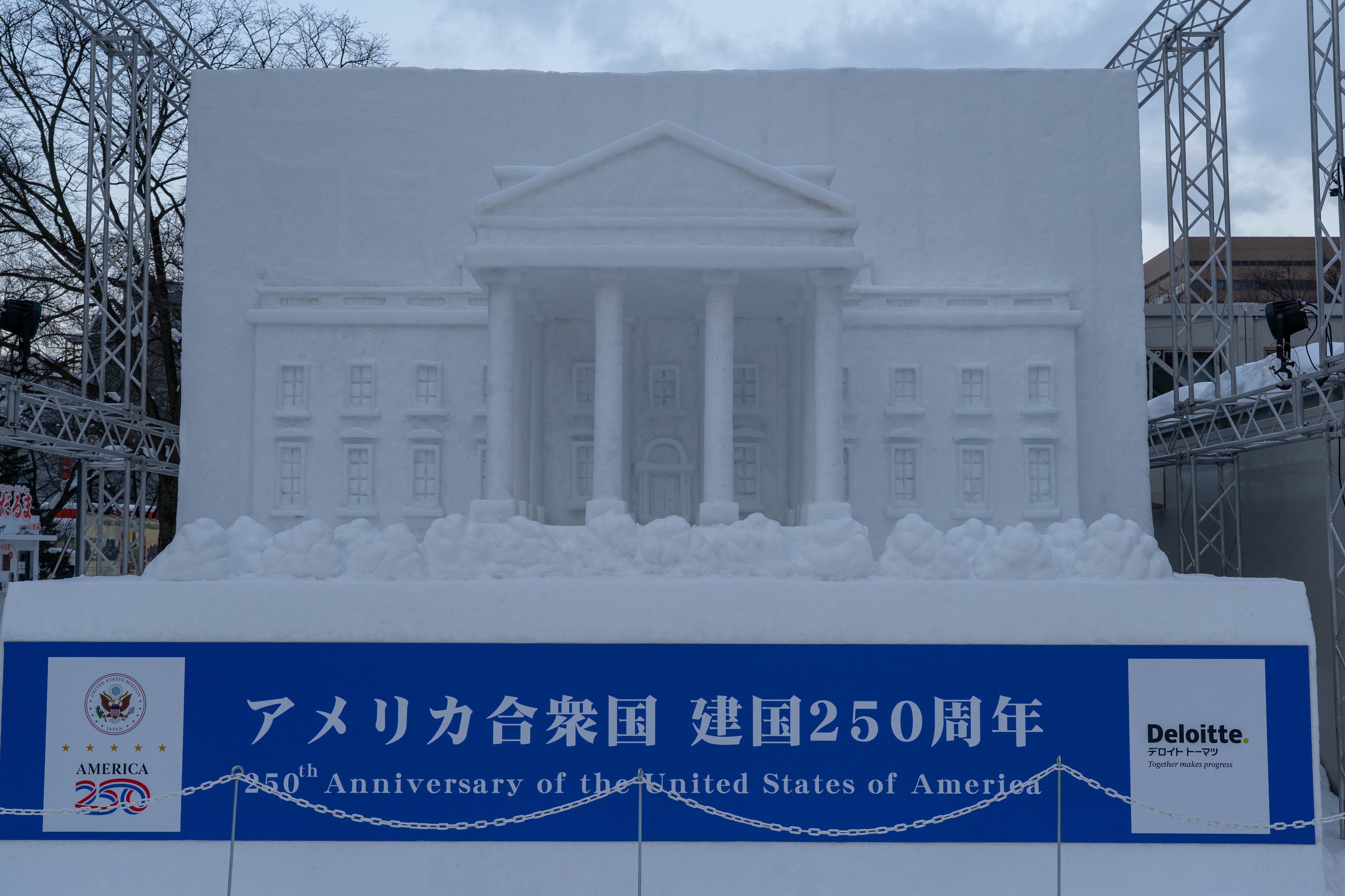 The White House A large snow sculpture created by the 在日米国大使館 (Zainichi Beikoku Taishikan / U.S. Embassy Tokyo) to commemorate the 250th anniversary of the founding of the United States.