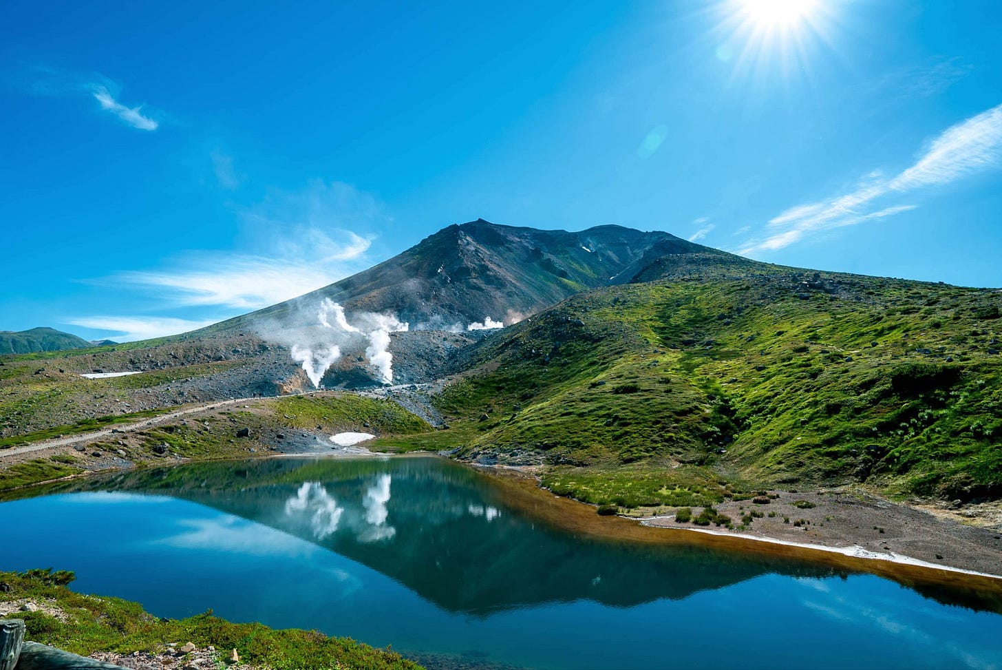 Among Daisetsuzan’s many routes, we began our ascent from the Mt. Asahi side. A ropeway makes it easy to reach Sugatami Pond, located at the mountain’s base. Its surface reflects Mt. Asahi like a mirror, showing a different face each season.