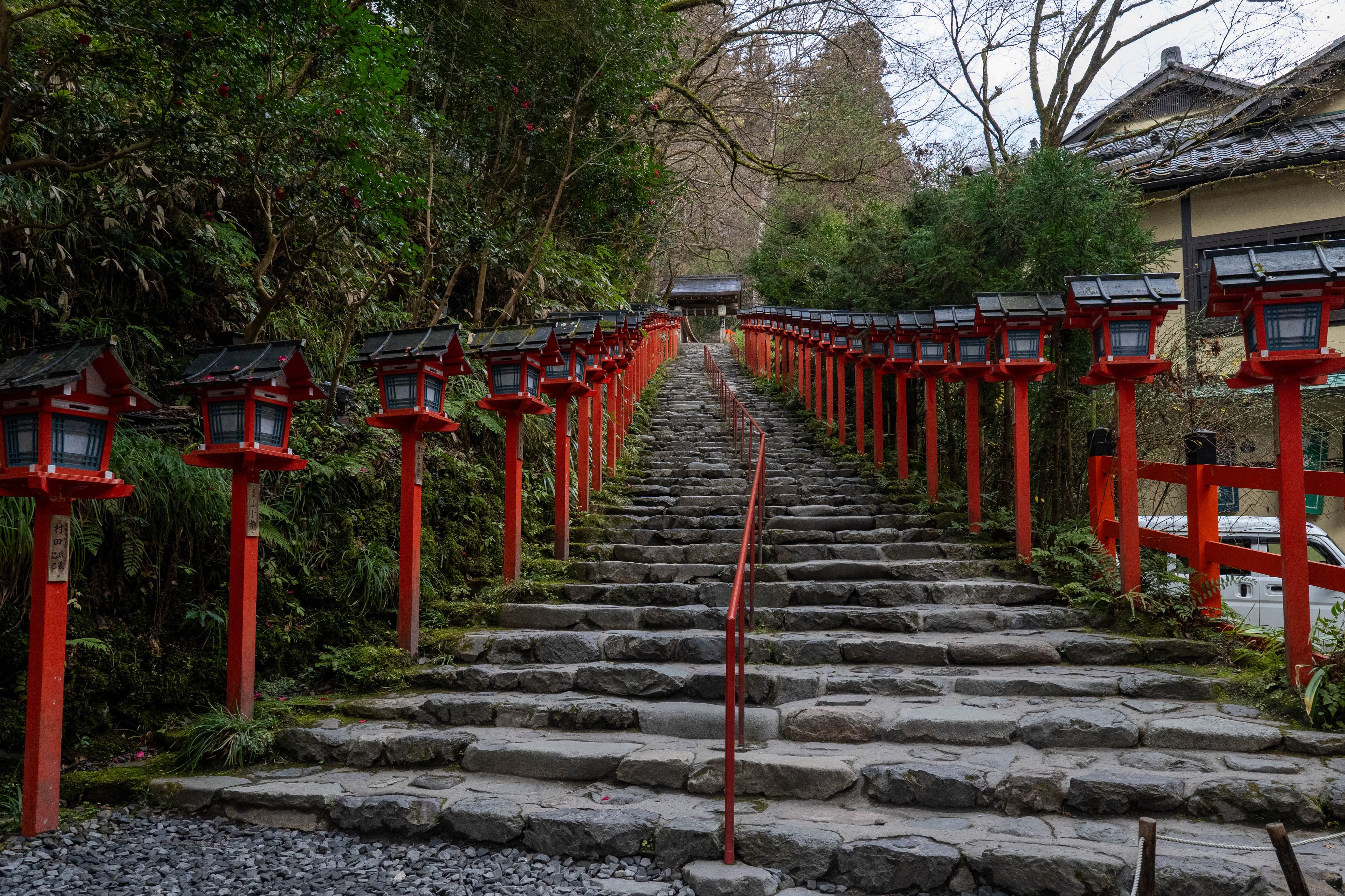 The approach begins at the second torii gate and climbs 87 steps, lined on both sides with red lanterns. This scene has become one of the most recognizable images of Kifune Shrine.