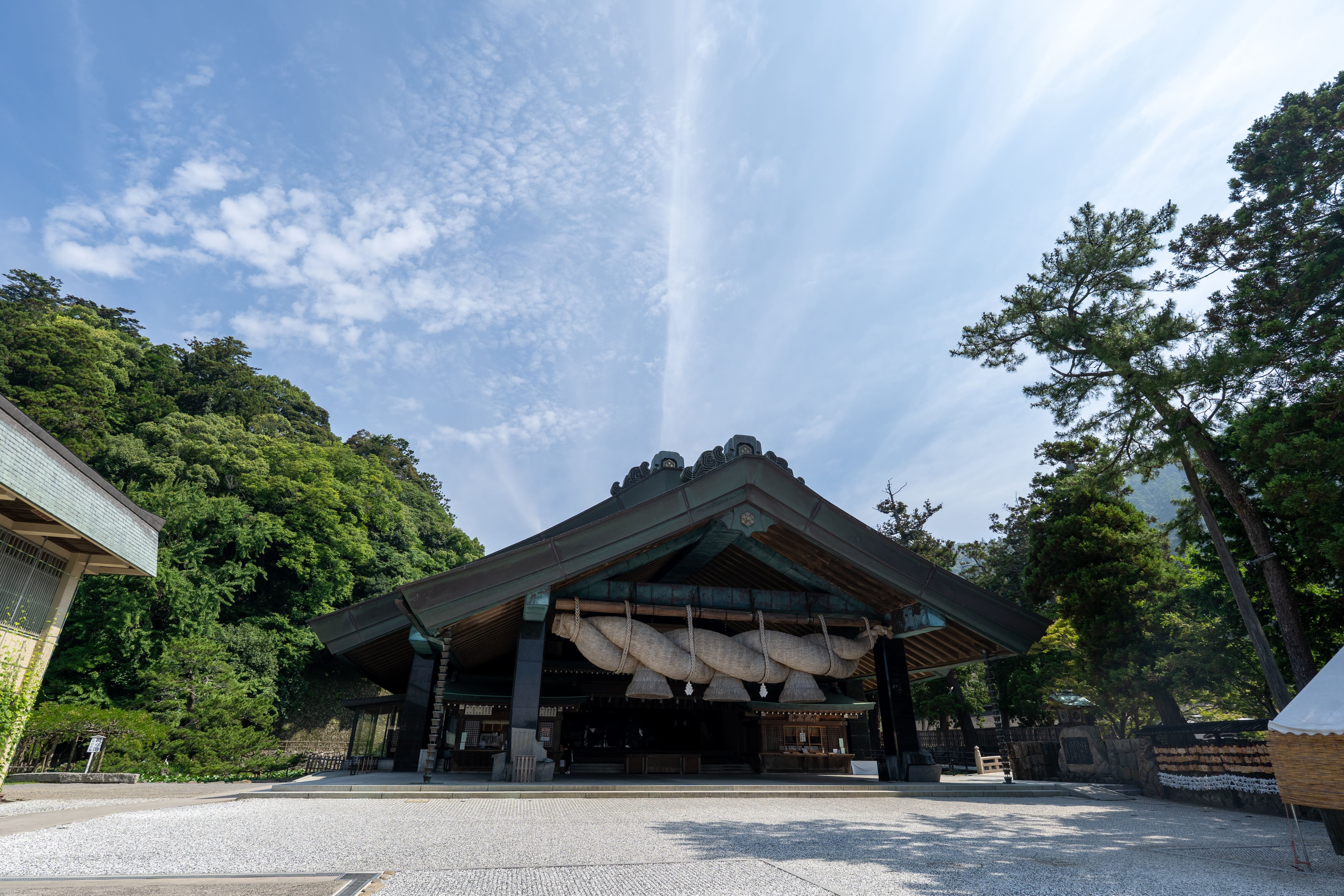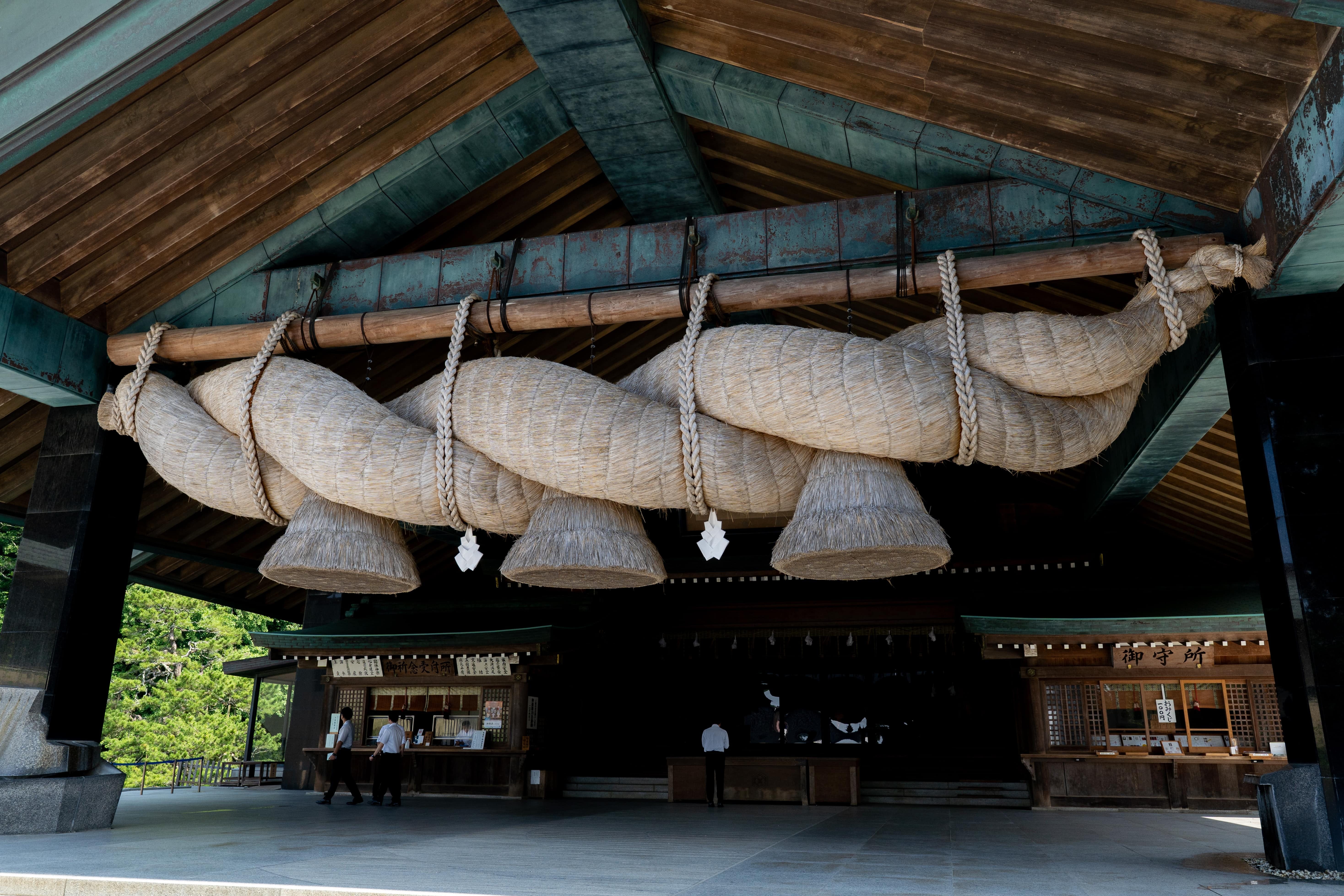 The shrine’s ropes are among the largest in Japan: the grand shimenawa of the Kagura Hall stretches about 13.6 meters long and weighs approximately 5.2 tons, while the rope at the worship hall measures about 6.5 meters and weighs around one ton.