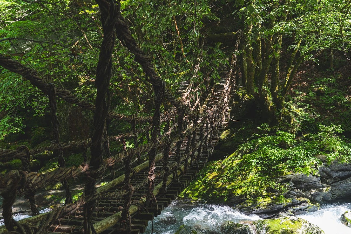 Hidden deep within the quiet valley of Oku-Iya in Tokushima Prefecture, at an altitude of 1000 meters, stand two modest vine bridges known as the Twin Kazura Bridges. This place holds the wisdom of ancient times and a quiet, enduring beauty.