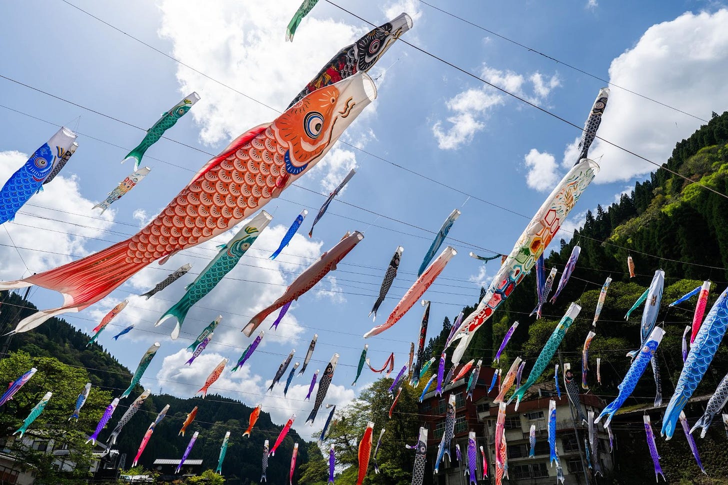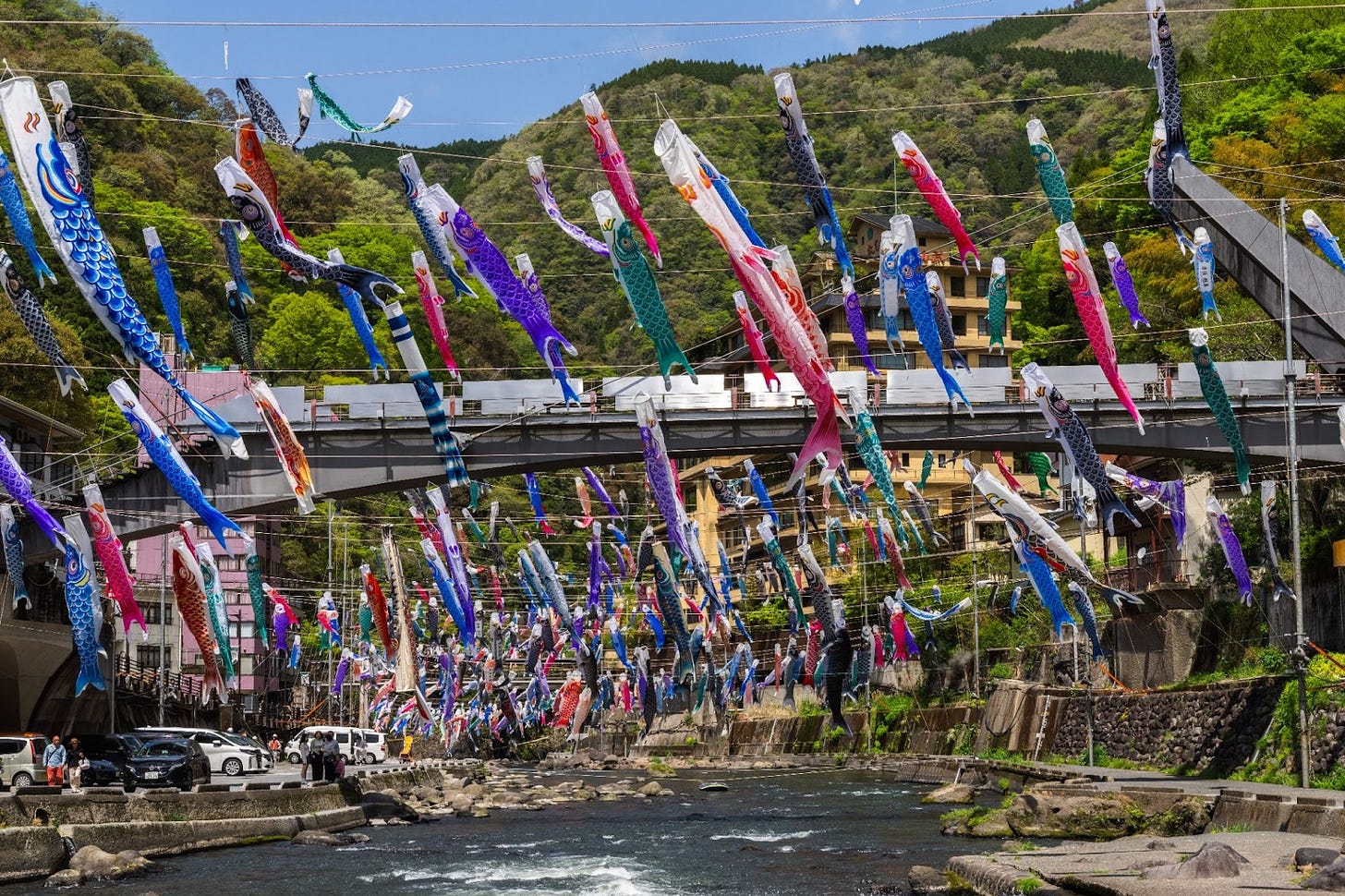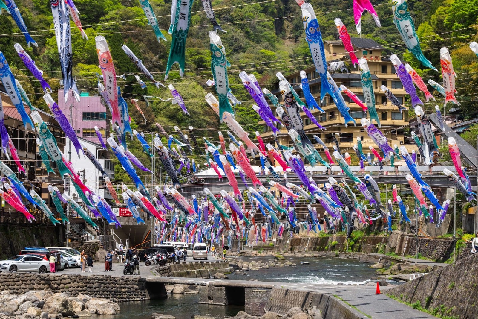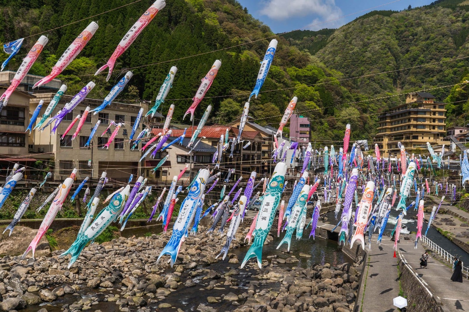 From April through May each year, roughly 3,500 colorful koinobori hang across ropes spanning the Tsuetate River, transforming the mountain-bound hot spring town into a vibrant display. This “Carp Streamer Festival” ranks among the largest in Japan, welcoming visitors with a sense of spring’s arrival and the warmth of local culture.