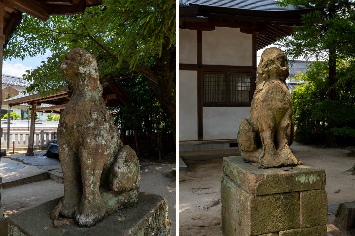 Near the Main Hall stands a pair of komainu (guardian dogs) carved from locally quarried kimachi stone. While their exact date is unknown, their unusual form differs from the typical “Izumo-kamae” style, and they radiate the presence of guardians who have long protected this sacred precinct.