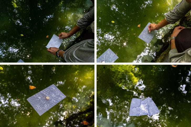 When I tried the divination, an extraordinary scene unfolded. My paper, though on still water, began to drift as if gently pulled by an unseen force. My husband, who joined me, saw his paper move in another direction entirely, and we watched in awe as each sank at a different pace. It felt impossible not to sense something beyond us at work.